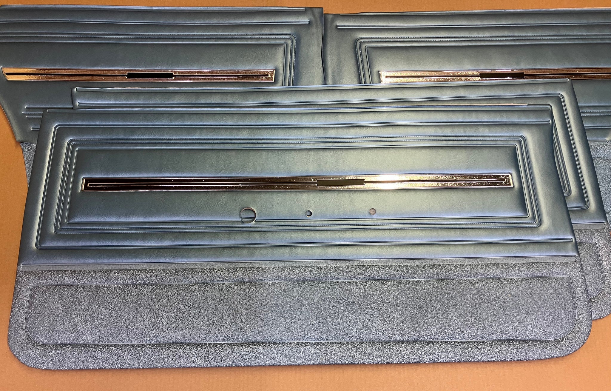 This listing is for a set of New Reproduction Door Panels for 1966 Chevelle Malibu and SS 2 Door Coupes. These were Never used or installed, High quality panels in the correct Light Blue 2 Tone color made by PUI. Drivers door panel has several small " pencil point " indentations below arm rest area due to storage issues. The other 3 panels are fine. This set is significantly discounted to account for the defect. See Pictures