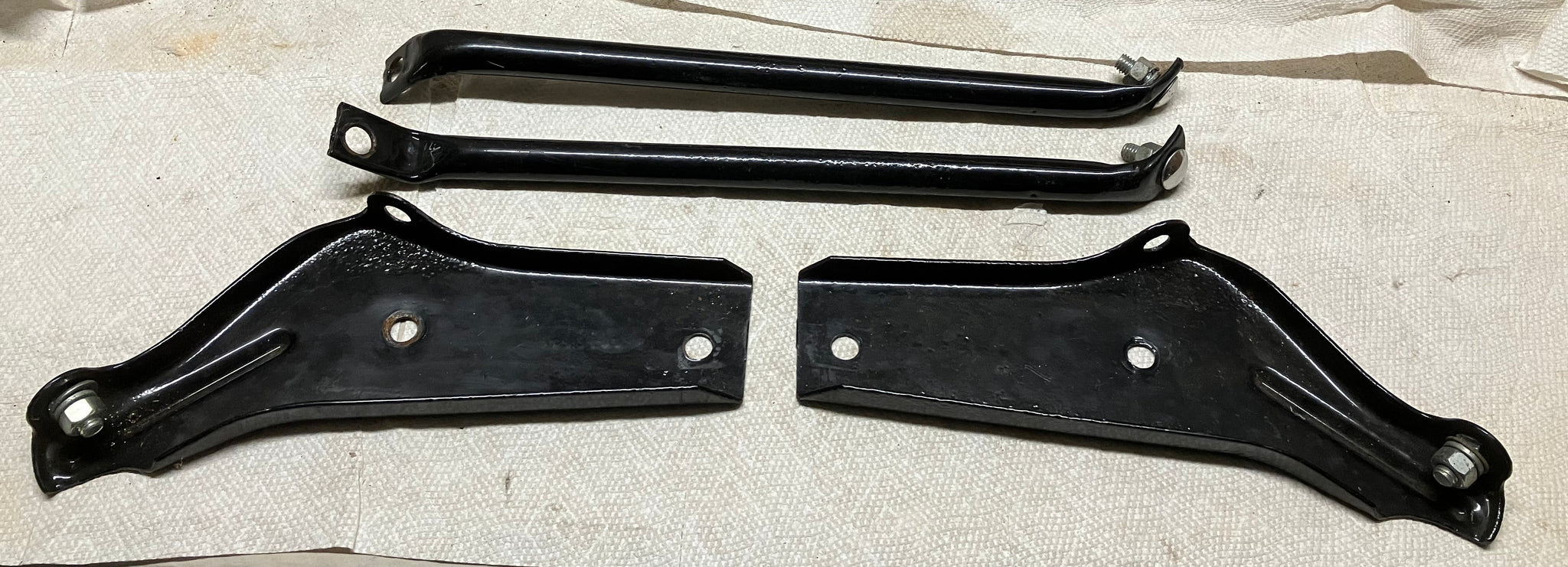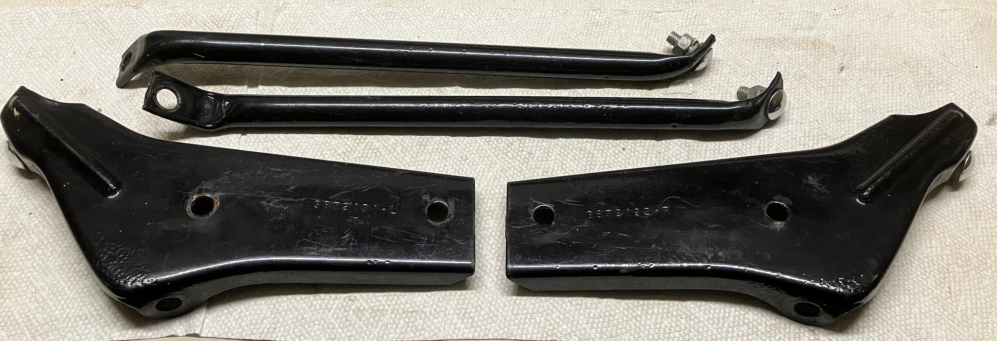 These are Original GM Rear bumper brackets 3872191 Right and 3872192 Left along with right and left rear outer bumper bracket braces for 1966 and 1967 Chevelle, Chevelle SS, and Malibu. These have minor pitting but good condition and they have been powder coated.